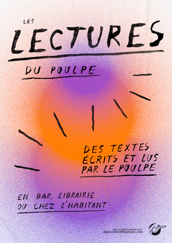 Parce que le Poulpe est aussi un endroit d’expérimentations artistiques, et parce qu’il est mené par des personnes portées par des désirs d’écriture, nous avons décidé, pour alimenter cette joyeuse effervescence, d’organiser des soirées littéraires : les Lectures du Poulpe.